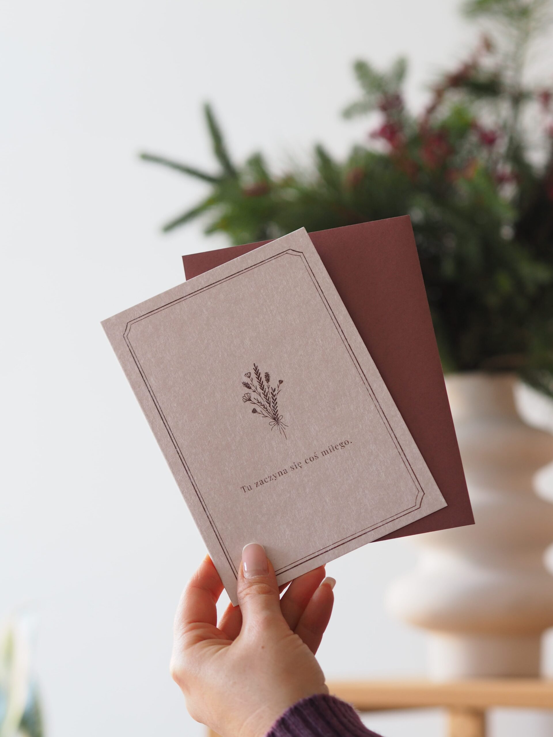 Subtelna ilustracja delikatnego, brązowego bukieciku oraz napis „Tu zaczyna się coś miłego” tworzą ciepłą zapowiedź dobrych chwil.
