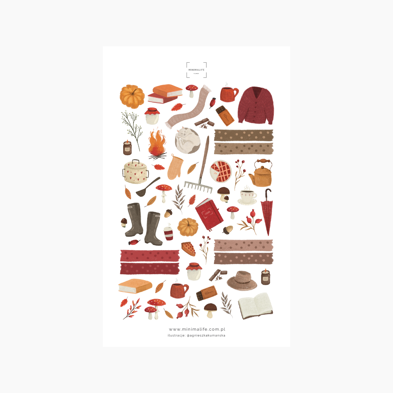 Arkusz naklejek inspirowany jest codziennymi, jesiennymi przyjemnościami – idealny do zaznaczania ważnych wydarzeń, dekorowania rozpisek i dodania koloru do codziennych planów. Pasują doskonale do plannerów MINIMALIFE, ale sprawdzą się także w bullet journal, kalendarzach i wszelkich kreatywnych projektach.