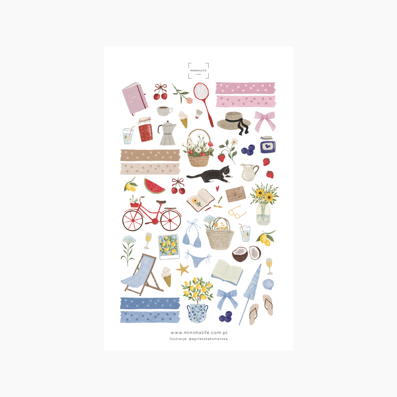 Arkusz pełen jest naklejek inspirowanych letnią codziennością – od beztroskiego odpoczynku na świeżym powietrzu, po drobne przyjemności, które przynosi każdy słoneczny dzień. Idealnie pasują do plannerów MINIMALIFE, ale świetnie sprawdzą się też w bullet journal, zeszytach i kreatywnych projektach.