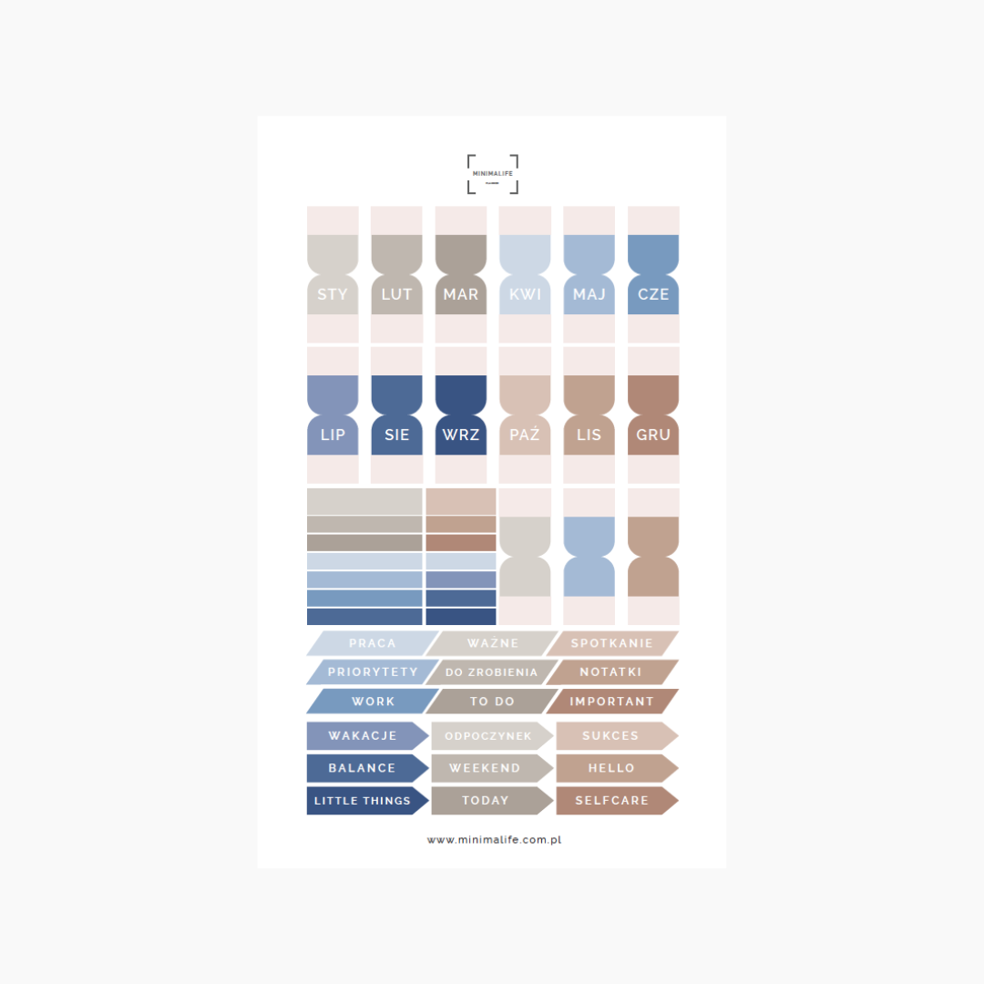 Naklejki wykonane z matowej folii, co zabezpiecza je przed zniszczeniem. Arkusz został uzupełniony o dodatkowe naklejki do podkreślania ważnych wydarzeń oraz naklejki z konkretnymi hasłami np. praca, spotkanie, odpoczynek, weekend, selfceare itp.