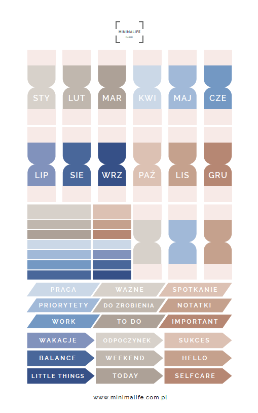 • Na arkuszu znajdziesz m.in. hasła: praca, spotkanie, priorytety, to do, worki, wakacje, odpoczynek, balance, selfceare.