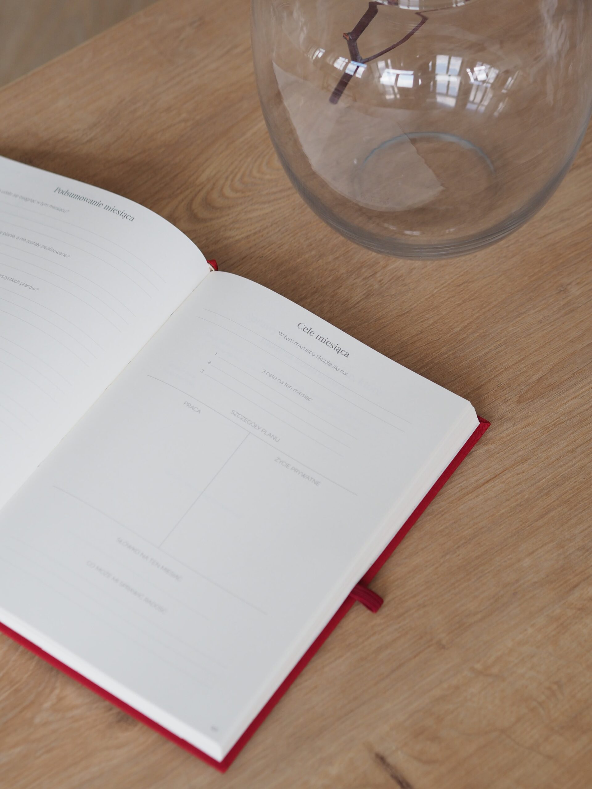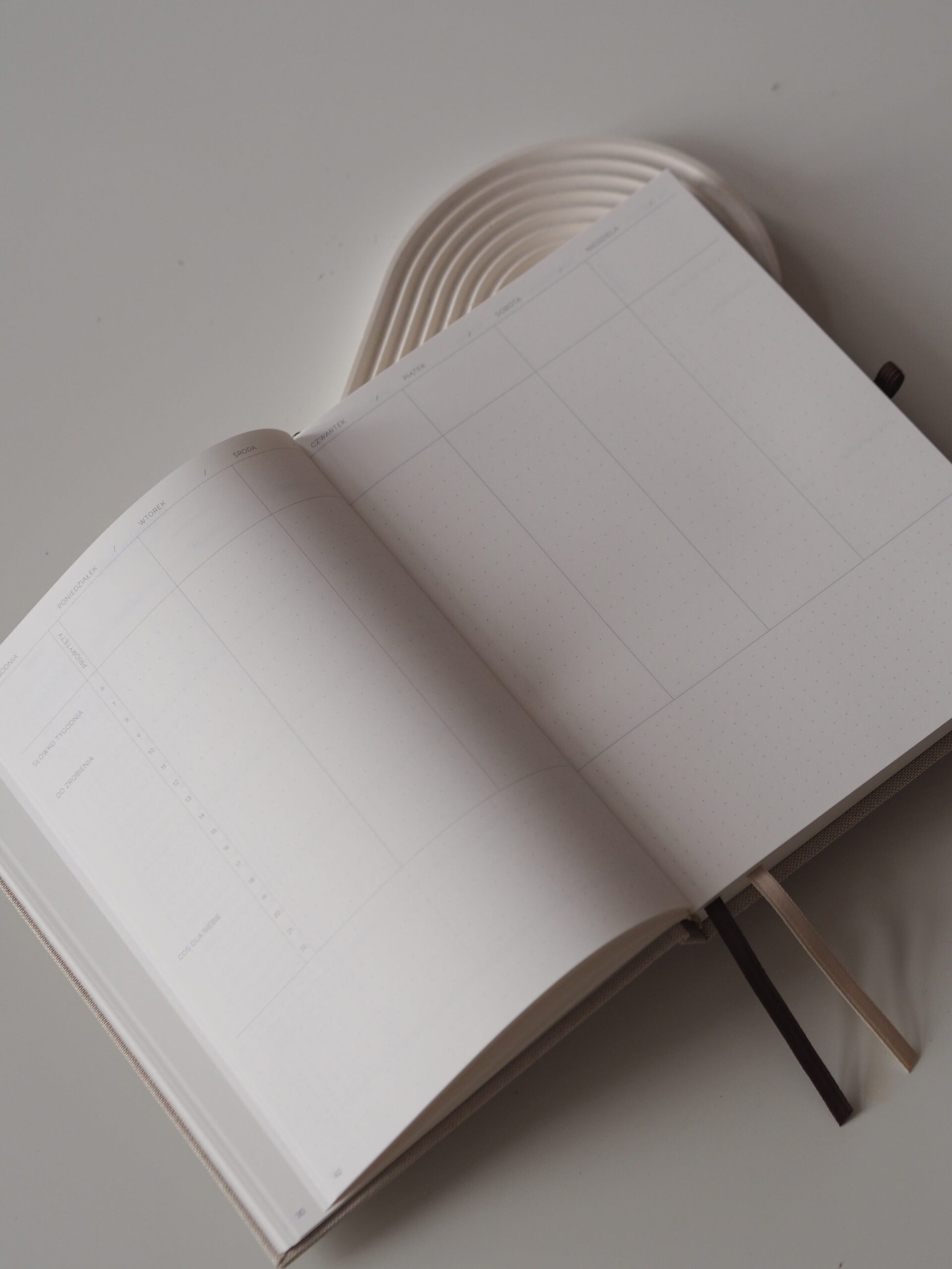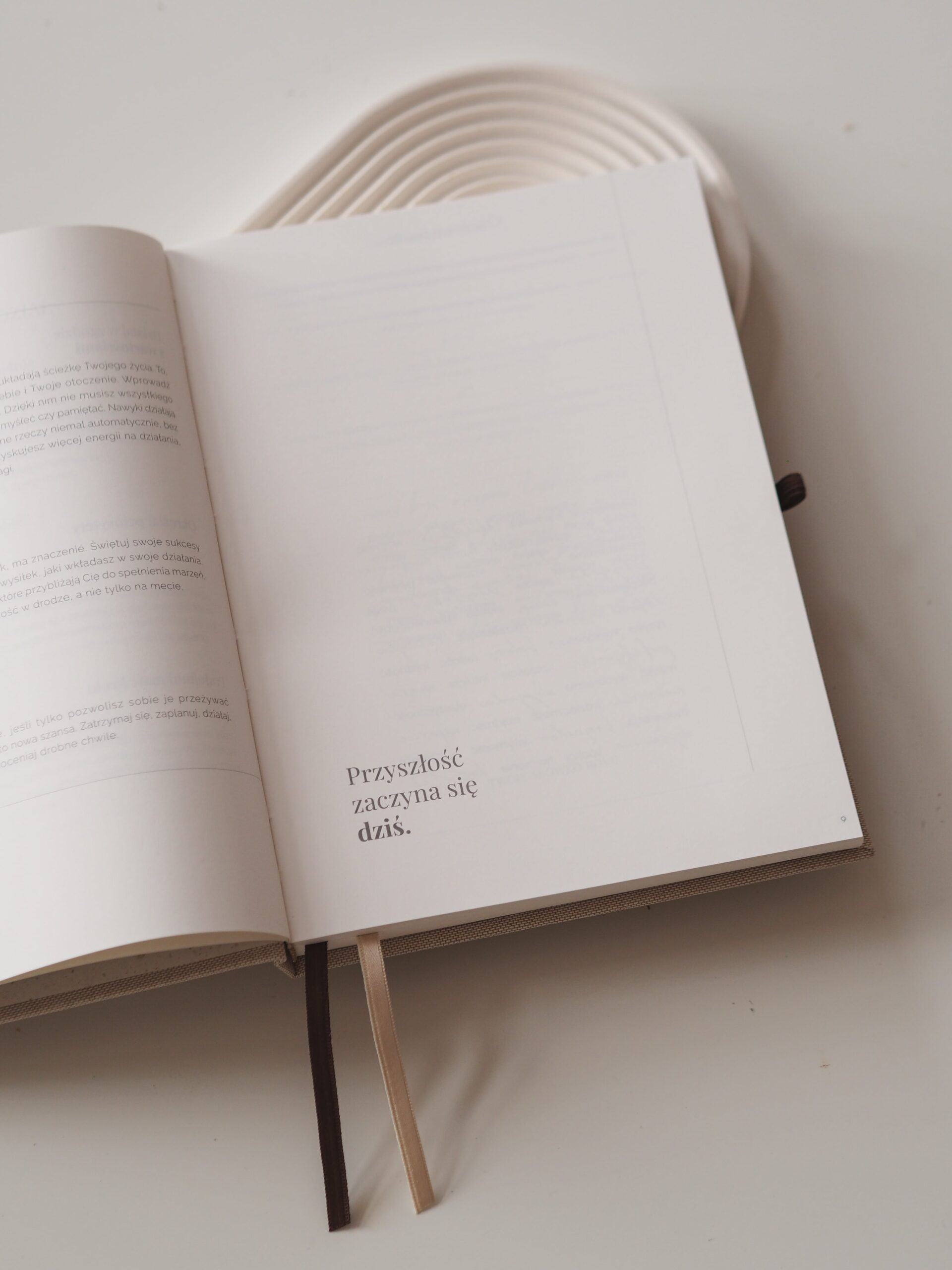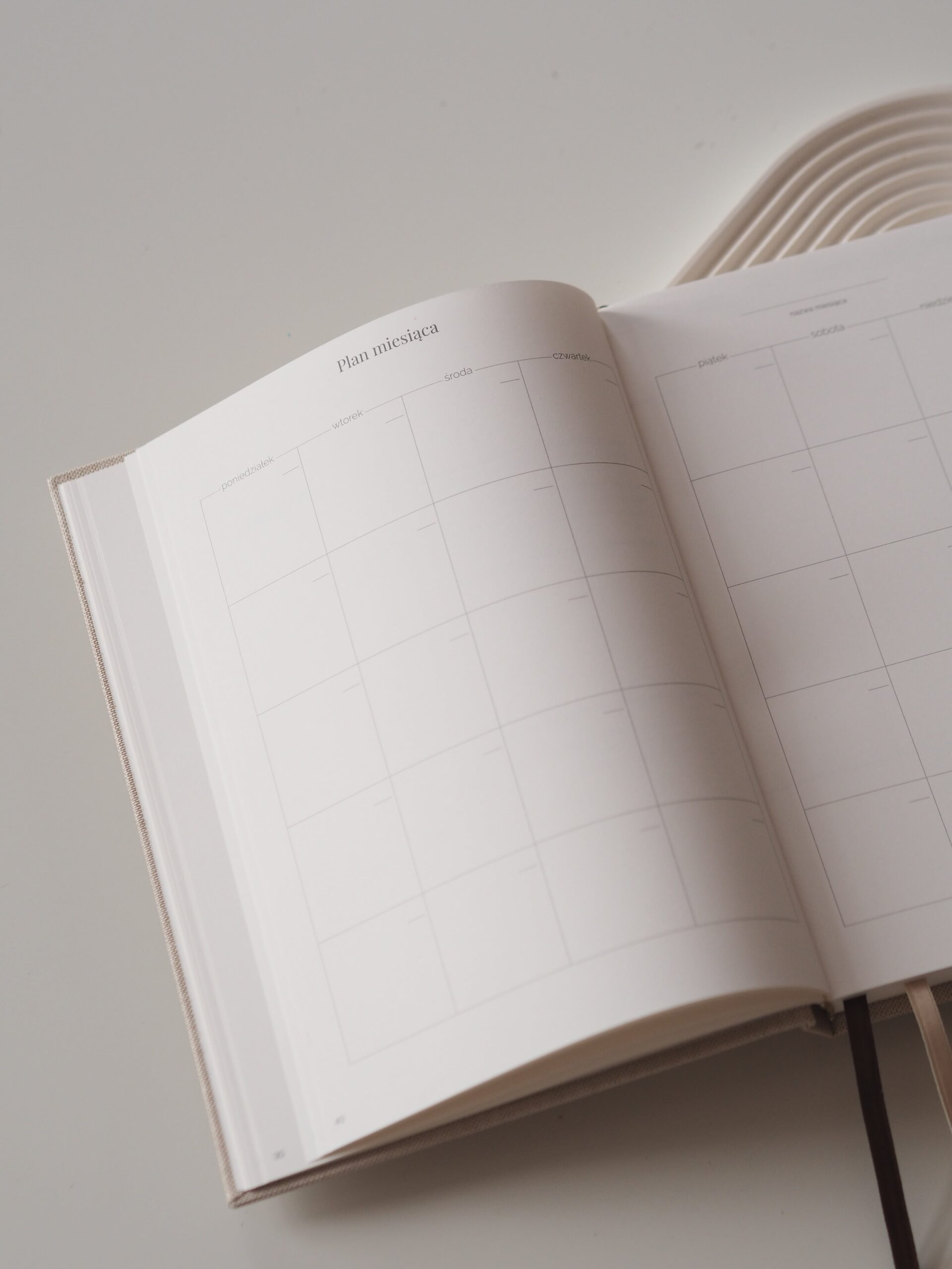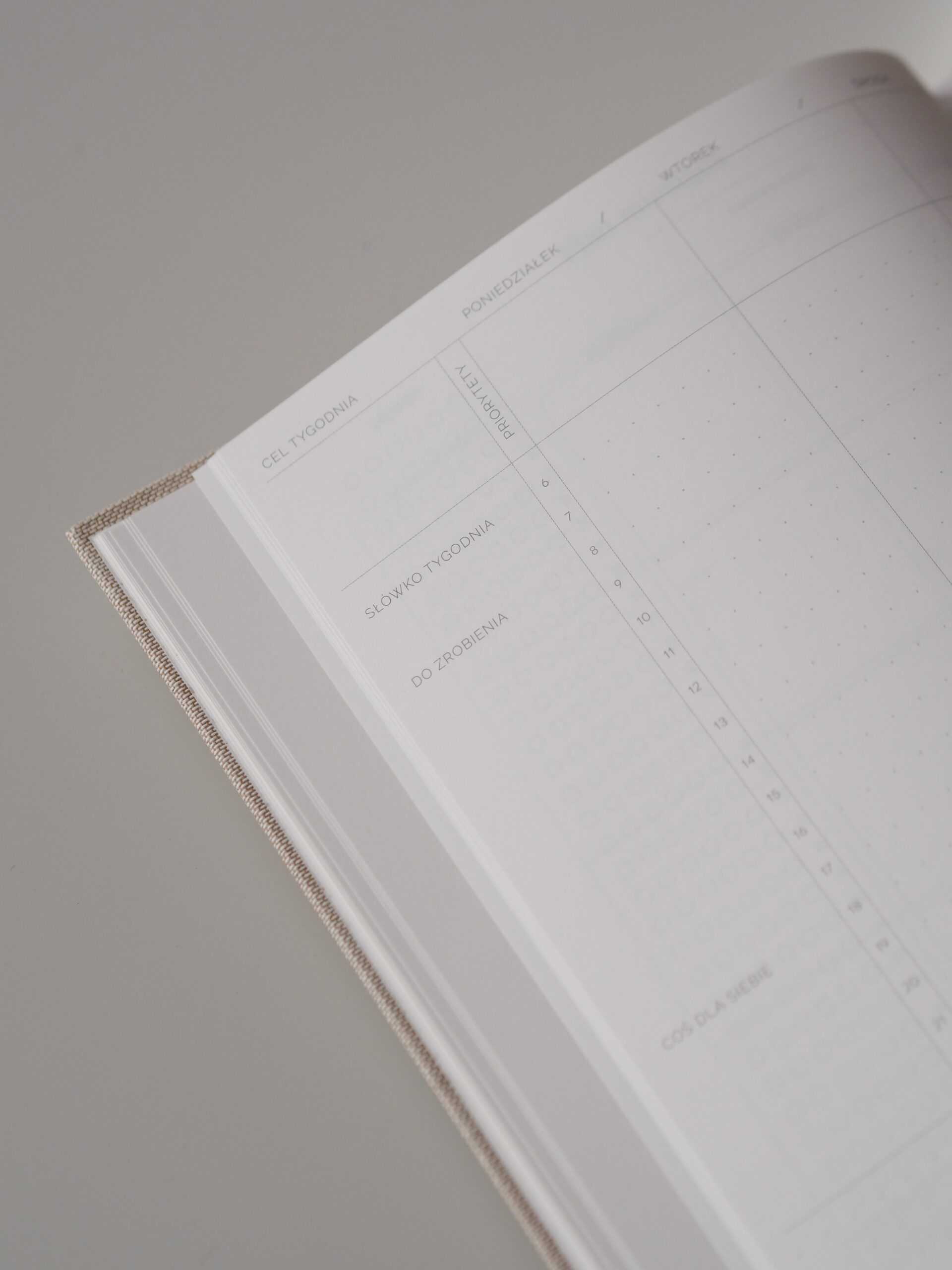 Wnętrze sprzyja codziennemu porządkowi: 12 miesięcy niedatowanych, tygodnie z planem godzinowym, cele tygodnia, coś dla siebie, habit tracker i przestrzeń na refleksję. Eleganckie złote detale dodają mu szyku, a praktyczne elementy – tasiemki, kieszonka, gumki – czynią go niezawodnym kompanem w pracy i życiu osobistym. Zaprojektowany i wykonany w Polsce.