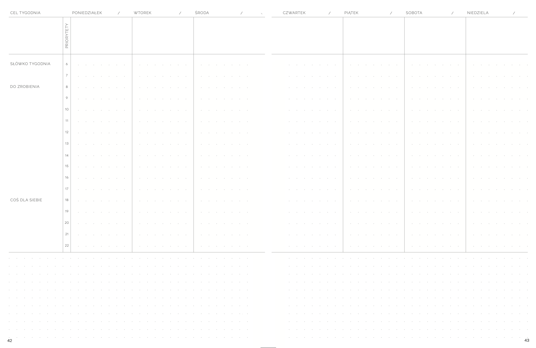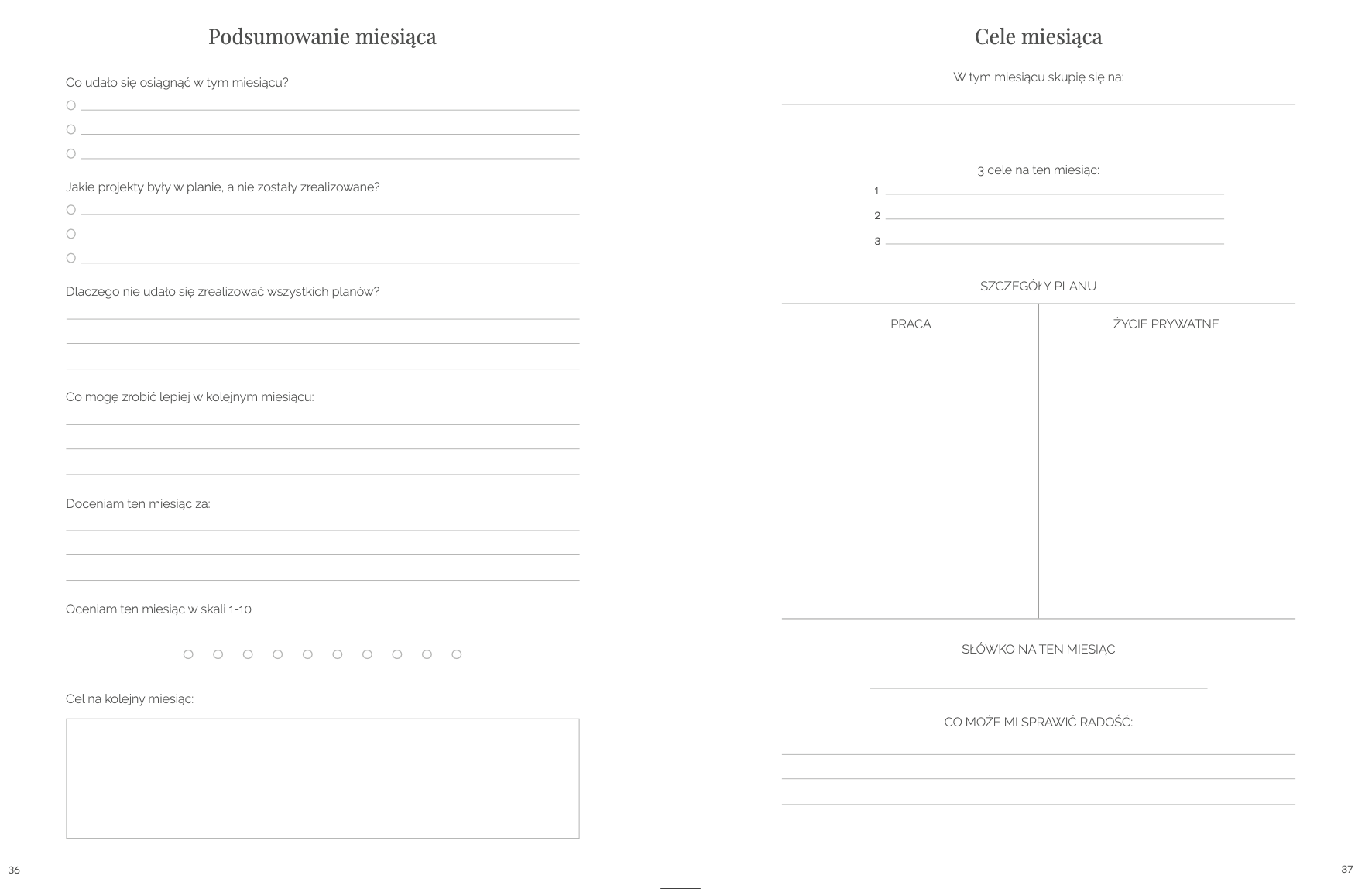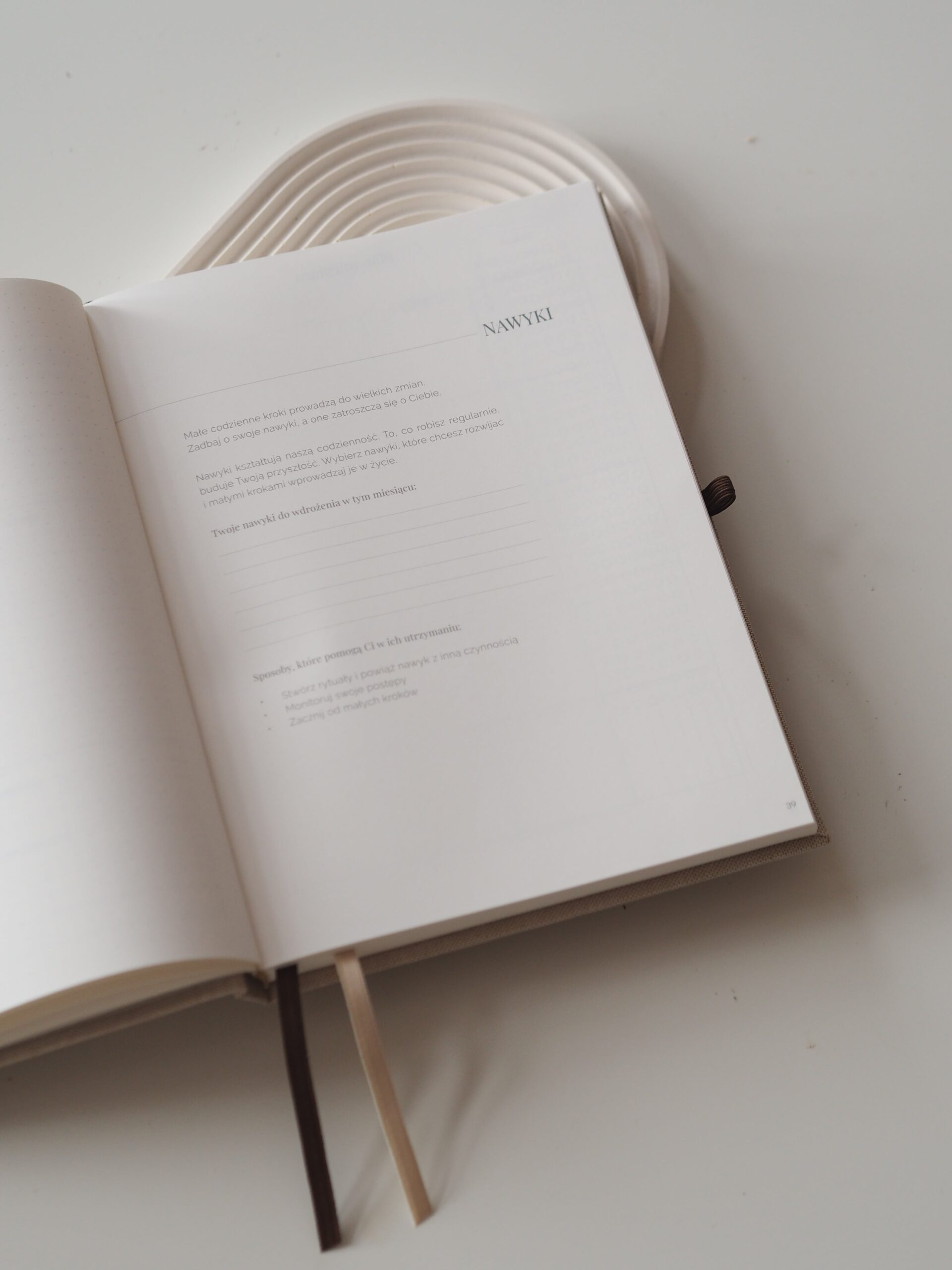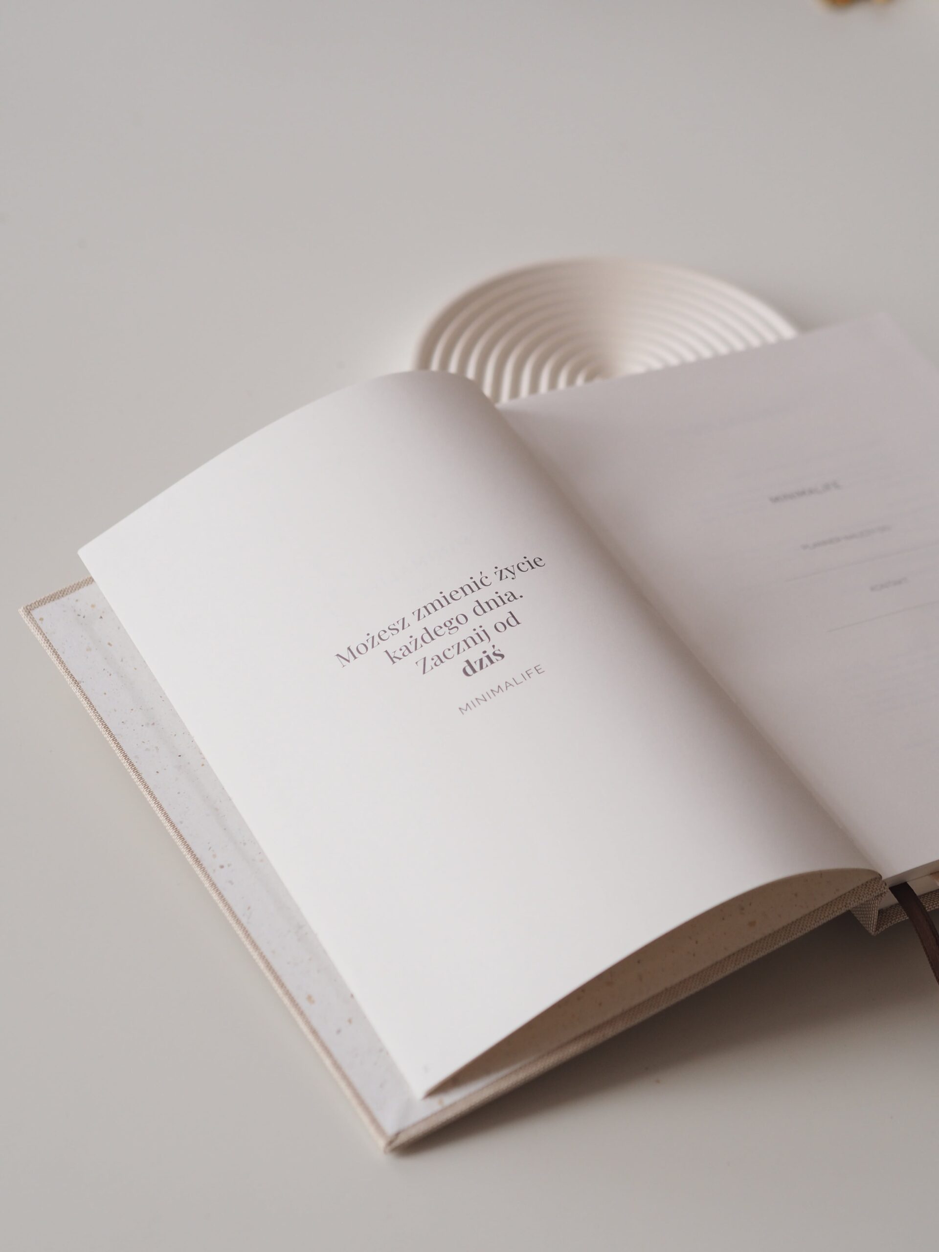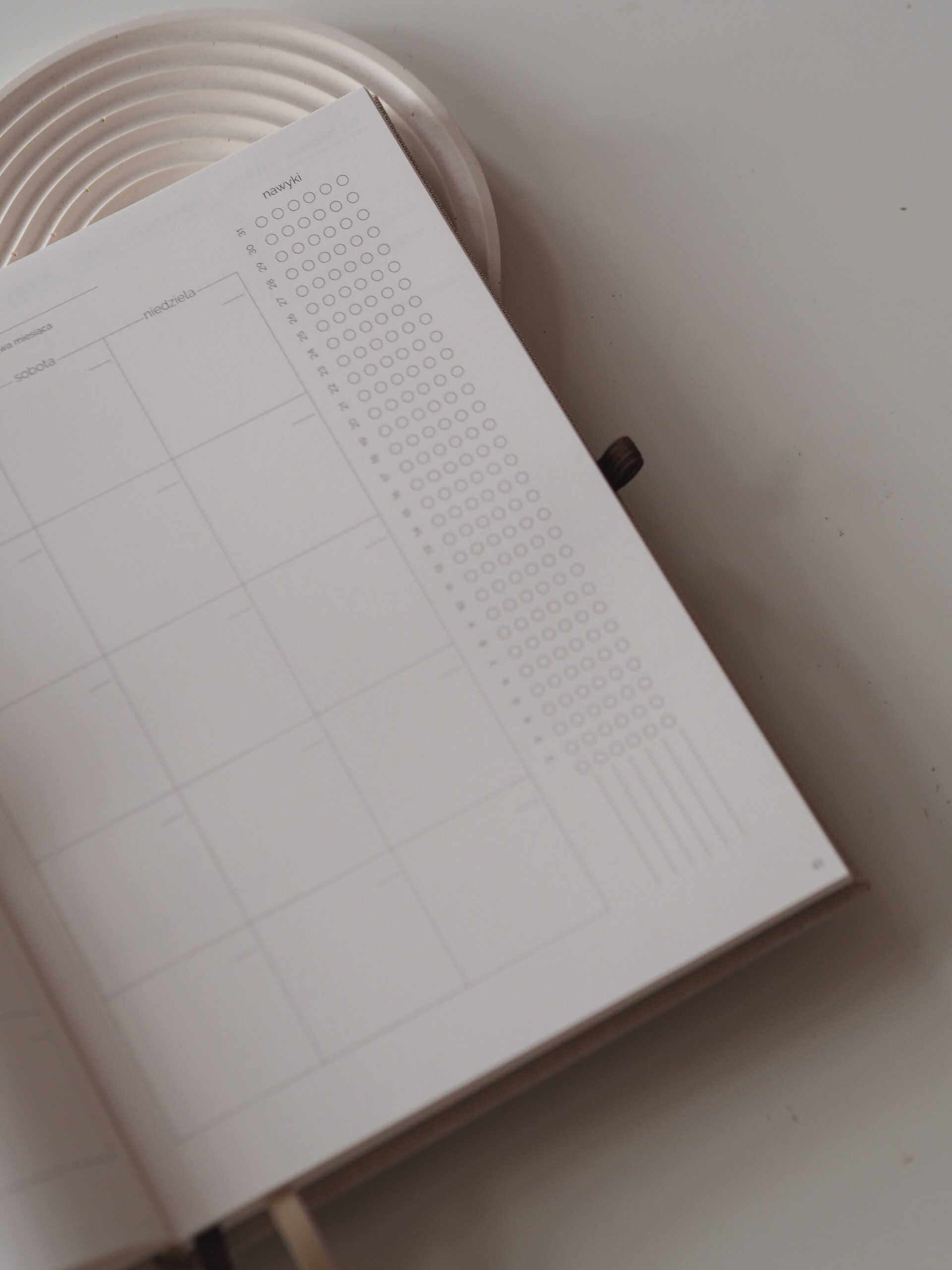 Wnętrze sprzyja codziennemu porządkowi: 12 miesięcy niedatowanych, tygodnie z planem godzinowym, cele tygodnia, coś dla siebie, habit tracker i przestrzeń na refleksję. Eleganckie złote detale dodają mu szyku, a praktyczne elementy – tasiemki, kieszonka, gumki – czynią go niezawodnym kompanem w pracy i życiu osobistym. Zaprojektowany i wykonany w Polsce.